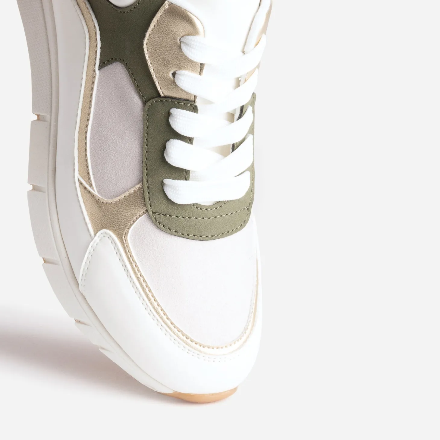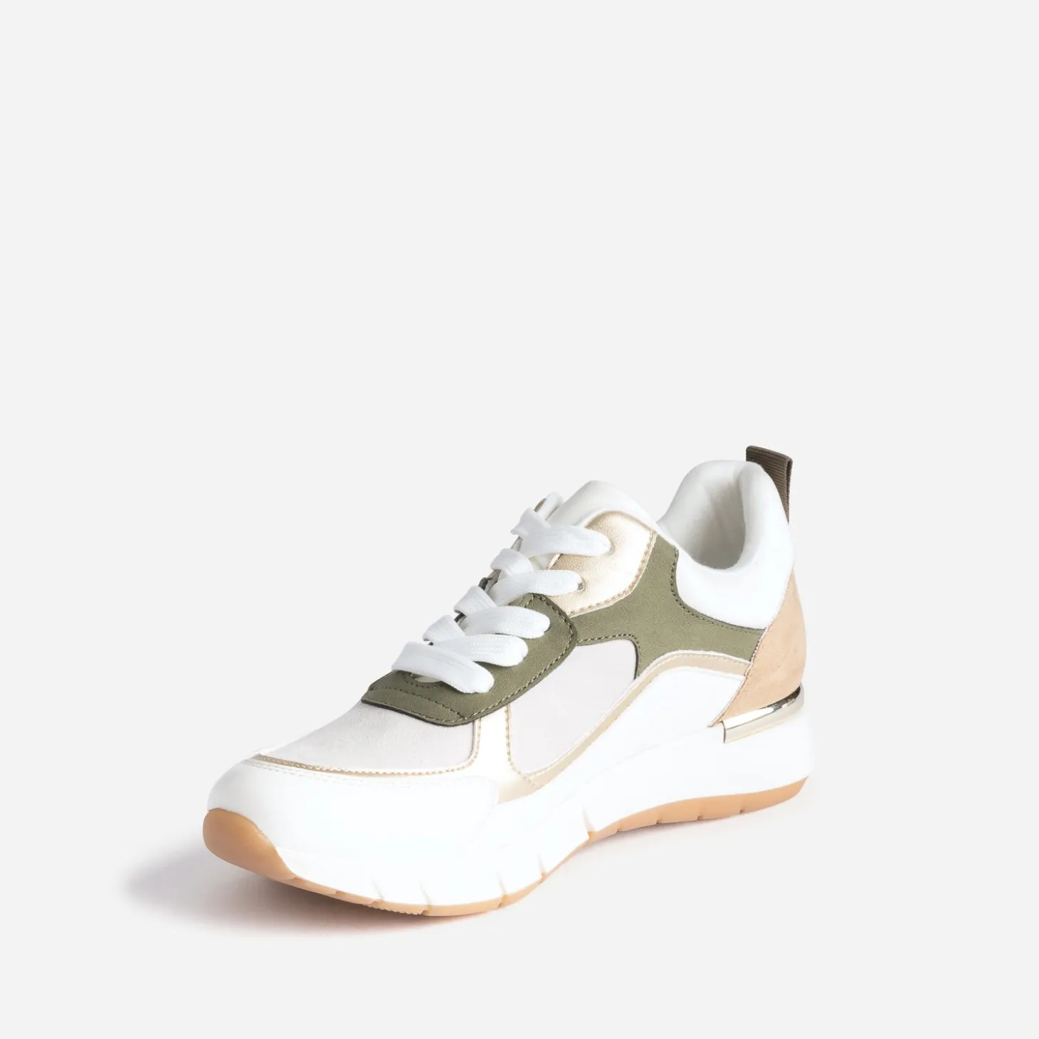 Blanc, kaki, beige et doré : l’impulsion chromatique est donnée ! Semelle première amovible : le confort est un véritable atout. Cette tennis femme s’accorde aussi bien avec une veste saharienne et un short en lin beige, qu’avec un tee-shirt blanc et un pantalon battle, ou une robe blanche et des accessoires dorés. Neutre et intemporel, c’est un modèle parfait, à porter saison après saison.