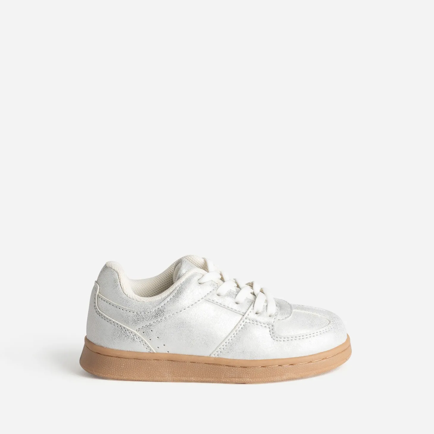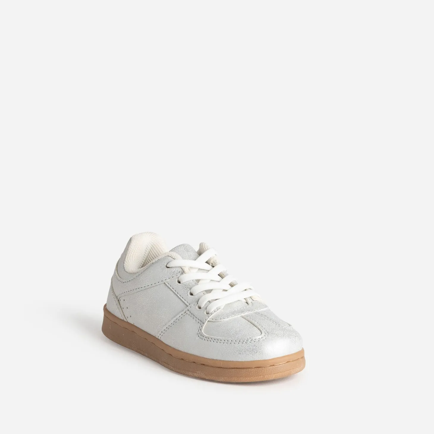 Pile dans la tendance, cette tennis n’a qu’un seul objectif : chausser les petites filles avec confort et style. En matière synthétique, elle se décline en coloris argenté, avec une finition brossée. Rythmée de découpes, elle est montée sur une semelle camel. Un modèle très actuel, qui s’accorde facilement avec des couleurs froides, comme le bleu, le vert ou le violet, et bien sur, le blanc et le gris.