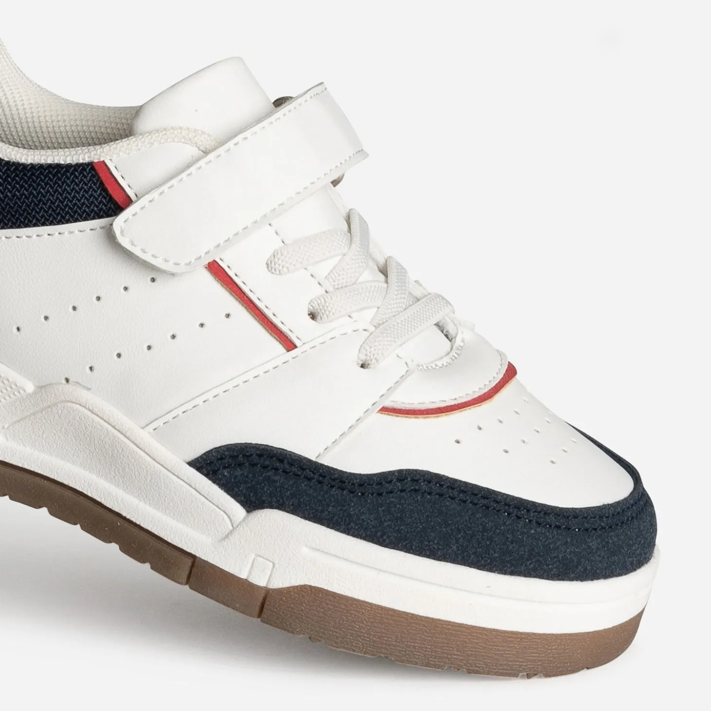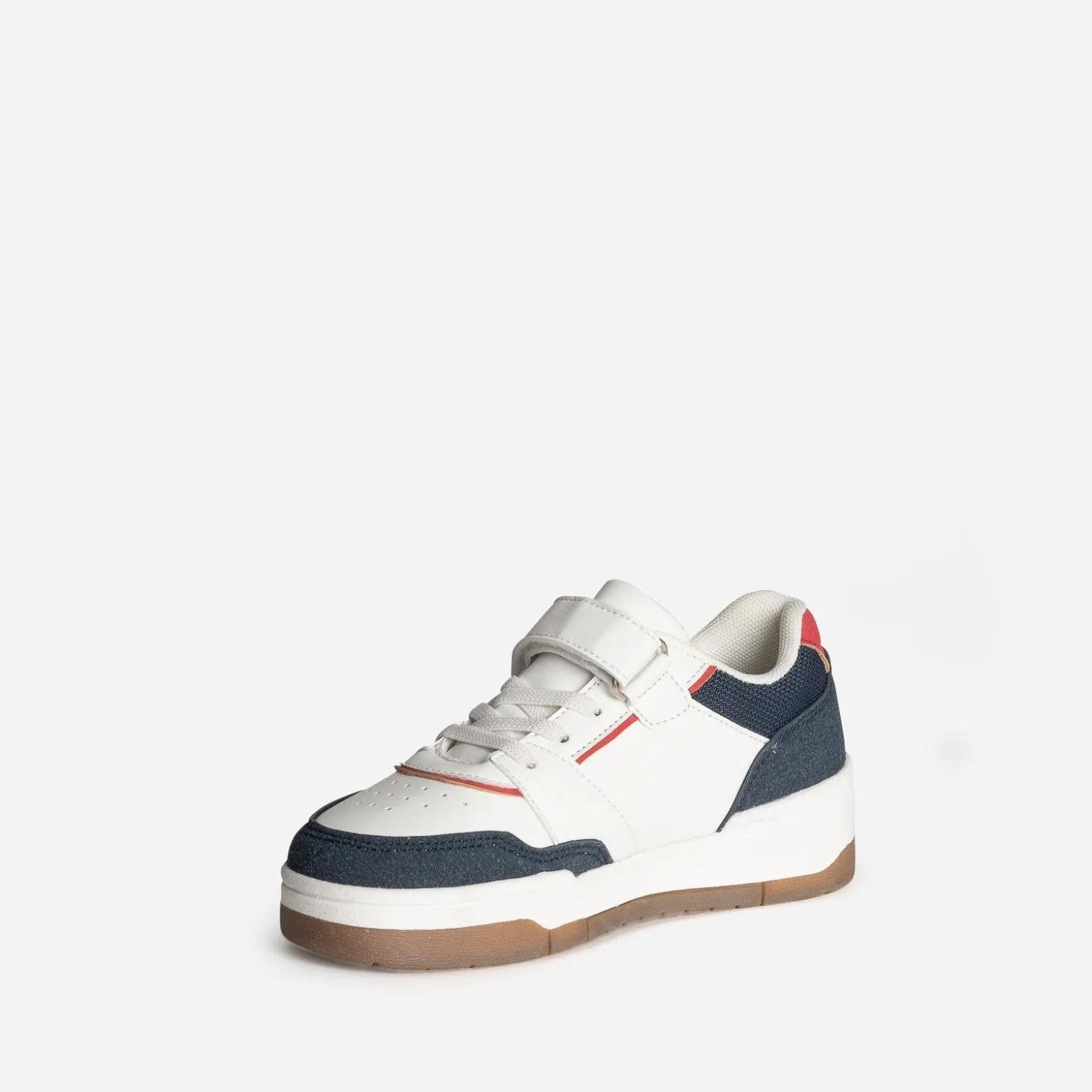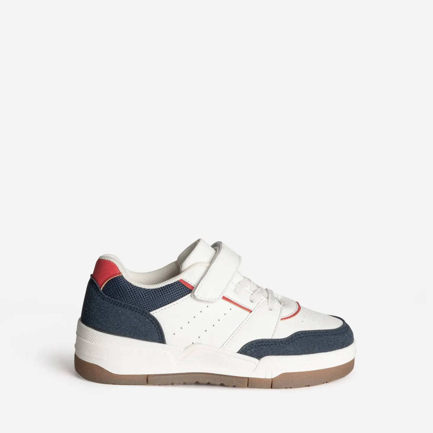 Blanc, bleu, rouge : le trio reprend du service sur une tennis enfant, pile dans l’air du temps. Perforations, jeux de découpes, associations de matières, lacet élastiqué et scratch, elle affirme son style, sans perdre en confort. Un modèle mixte, à accorder avec un sweat et un jean.