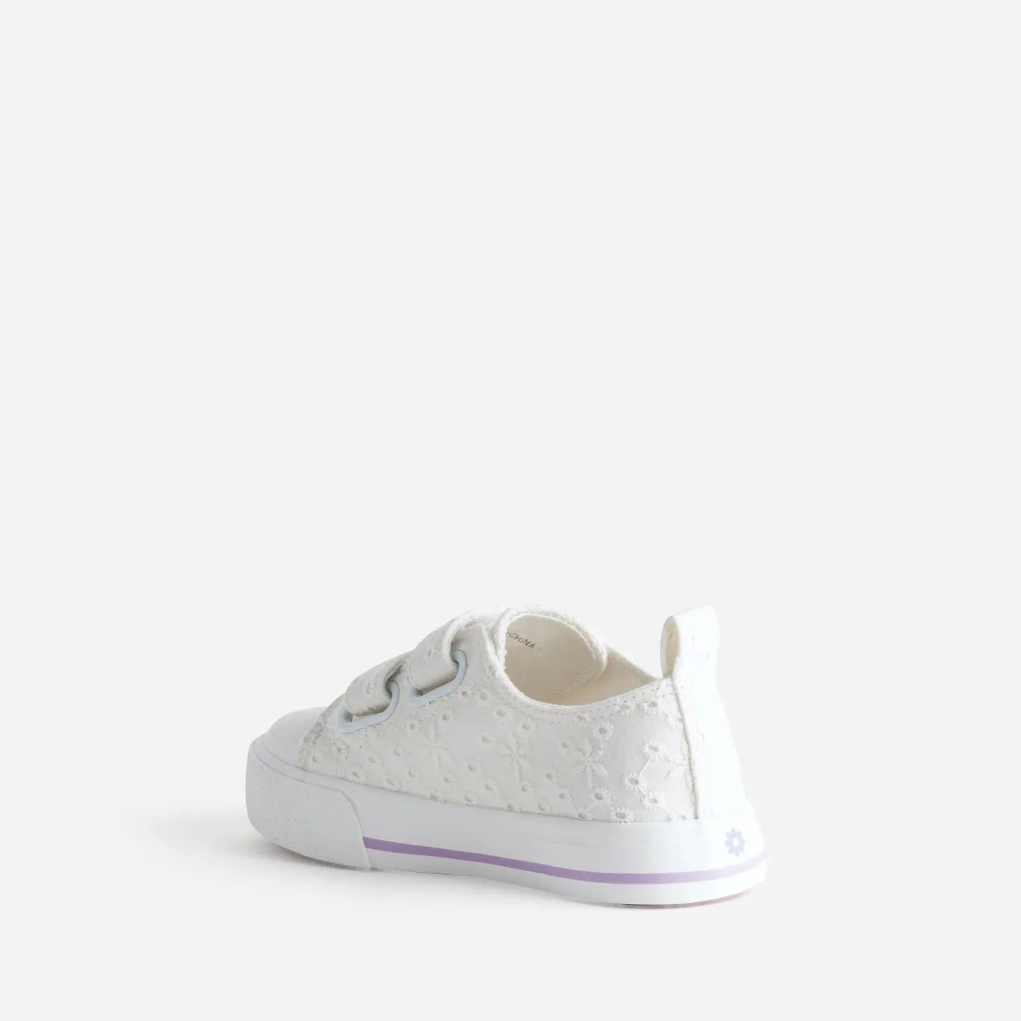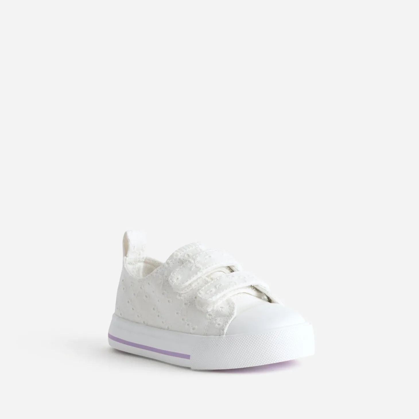 La tennis en toile est l’alliée du printemps. Blanche, elle est sublimée par une broderie anglaise ton sur ton et présente une semelle soulignée d’une ligne parme. La fermeture par double scratch accompagne les petites filles dans le développement de leur autonomie. Un modèle intemporel, à essayer avec un tee-shirt blanc et une salopette-short en jean.