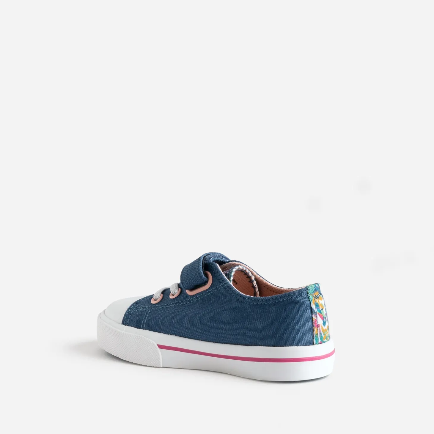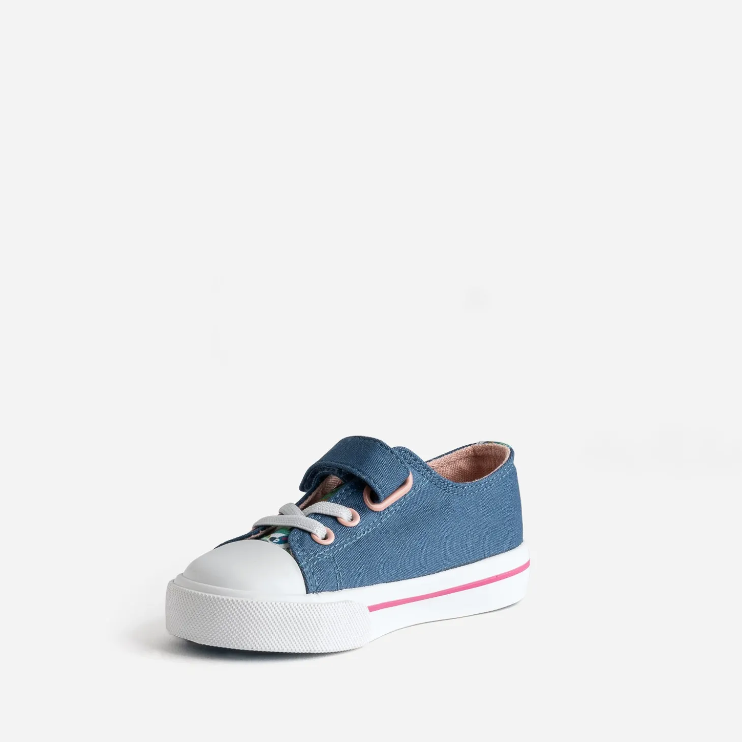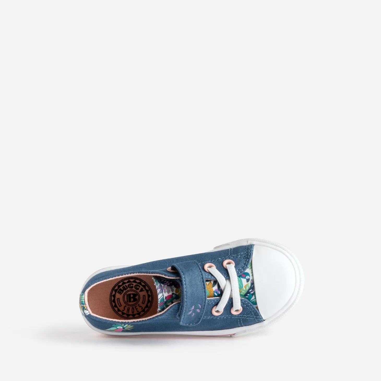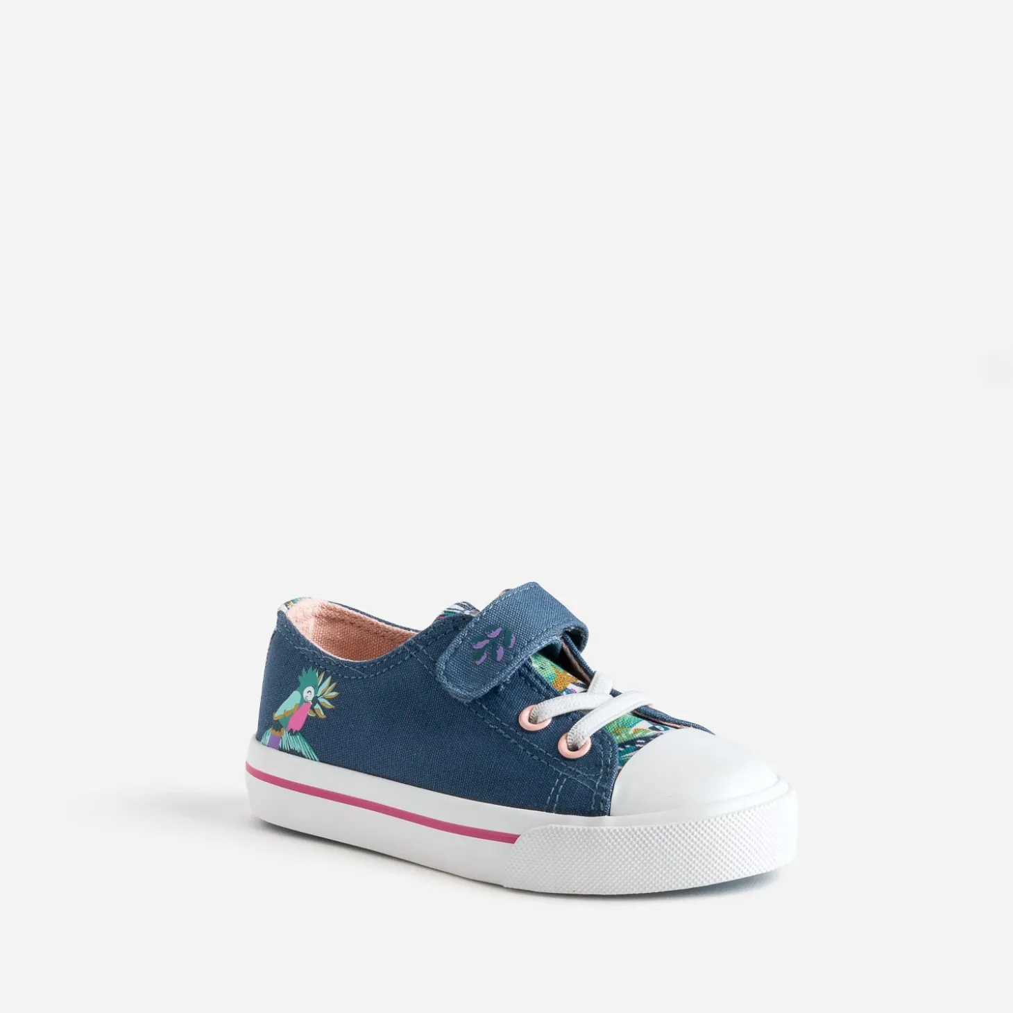 La tennis en toile est un must-have de la saison estivale. Bleue, elle s’anime de perroquets colorés, sur la languette, le côté et le contrefort. La doublure rose clair fait écho aux œillets, et la semelle est rythmée d’une rayure rose foncé. Lacet élastiquée et scratch facilitent l’entrée et la sortie du pied. Imaginez-la avec un total look denim, avec un tee-shirt de couleur rose vif.