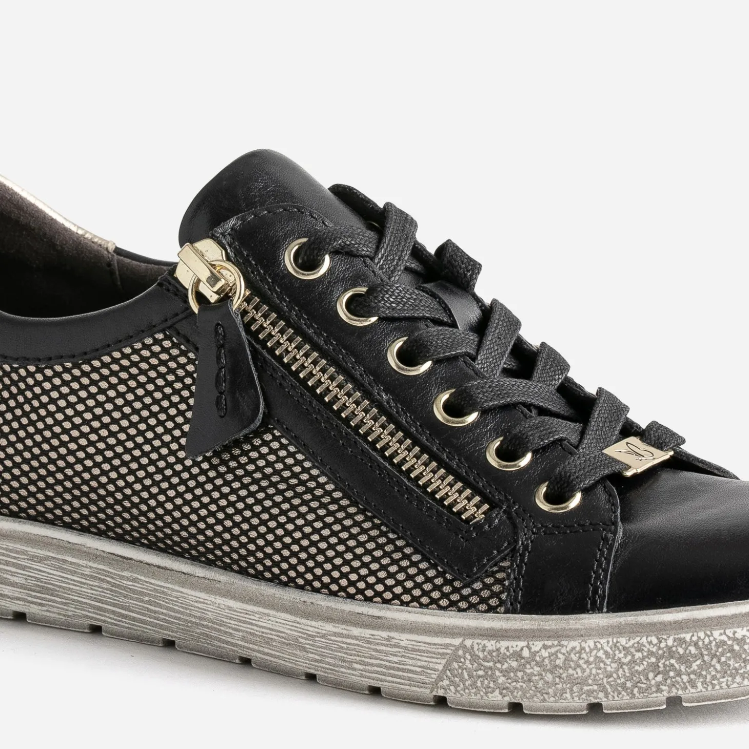 Cette nouvelle tennis dévoile une ligne simple, associant laçage et zip sur le côté. Laissez-vous séduire par son cuir noir ultra souple, animé d’un effet métallisé doré sous fine résille noire sur les quartiers et bronze sur le contrefort. La semelle première en cuir est dotée de la technologie ‘onAIR’, garantissant un meilleur amorti et une aération optimale de la chaussure.