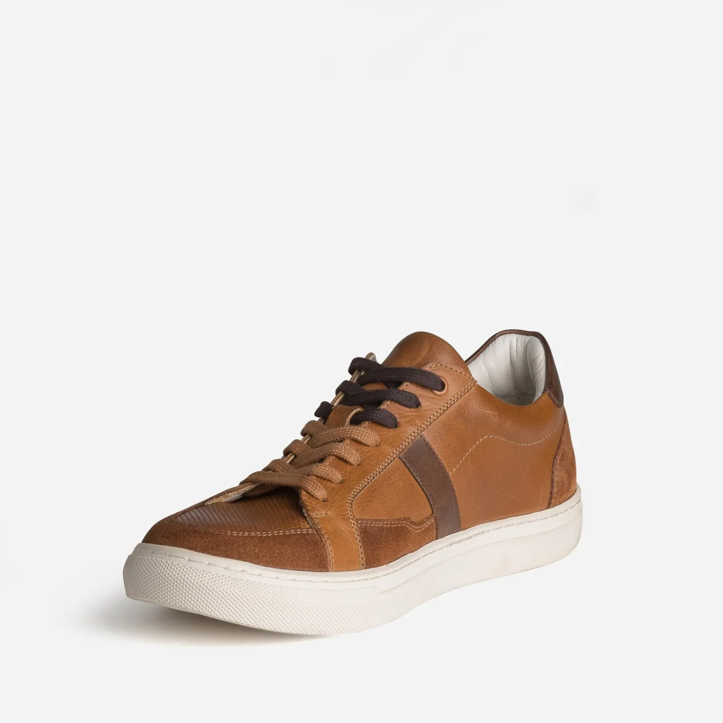 Cuir lisse, cuir velours, cuir embossé : la tennis pour homme maîtrise les découpes placées dans une harmonie étudiée. Déclinée dans un camaïeu autour du cognac, elle est livrée avec deux paires de lacets, l’un ton sur ton, l’autre marron foncé. Un modèle à privilégier avec du blanc, du bleu ou du kaki.