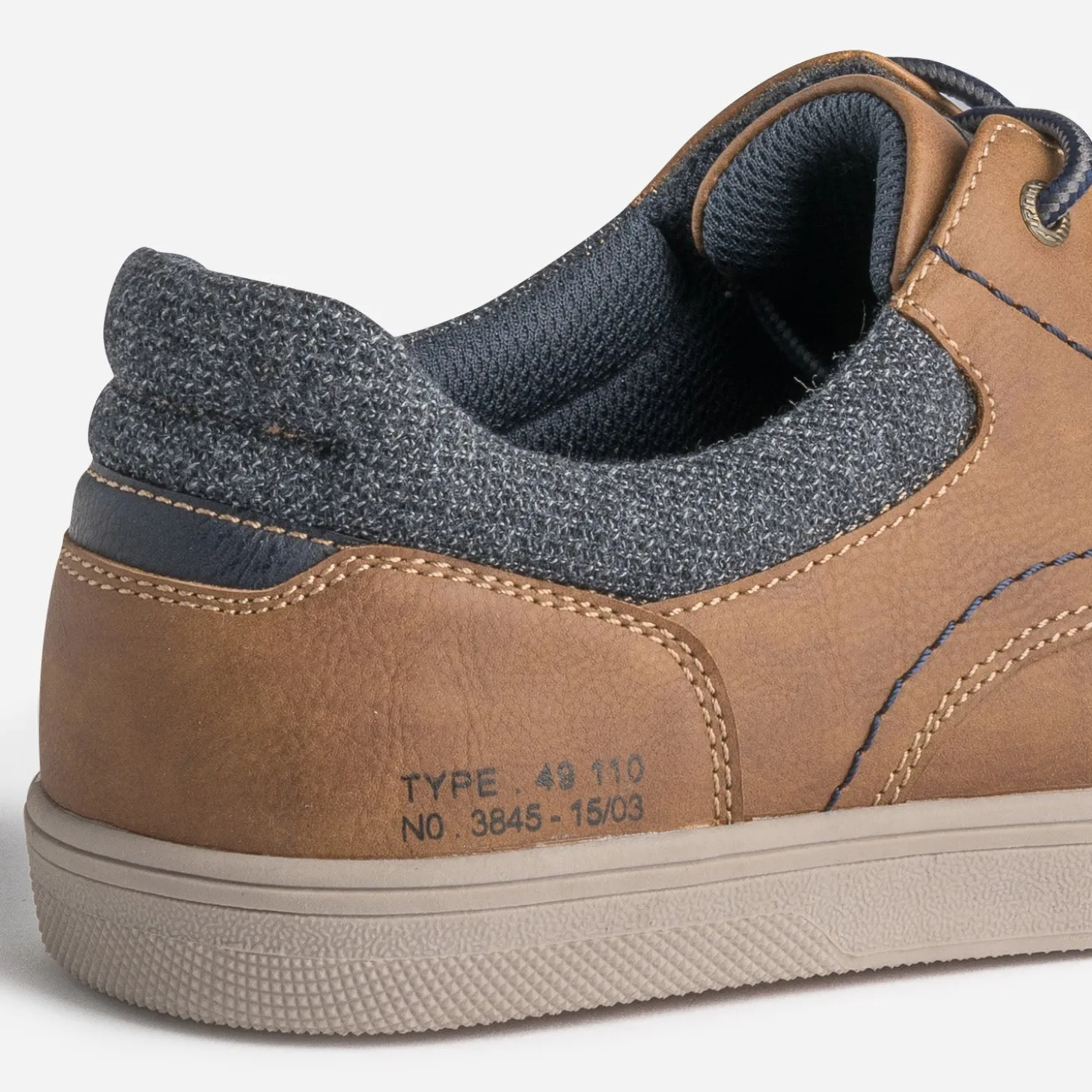 En matière synthétique de couleur cognac, la tennis homme sort de sa zone de confort. Elle est soulignée d’un empiècement en textile chiné sur le haut de la tige, de surpiqûres marine et d’un lacet-cordon marine et gris. Un modèle à jouer avec un pull marine et un pantalon chino bleu foncé.