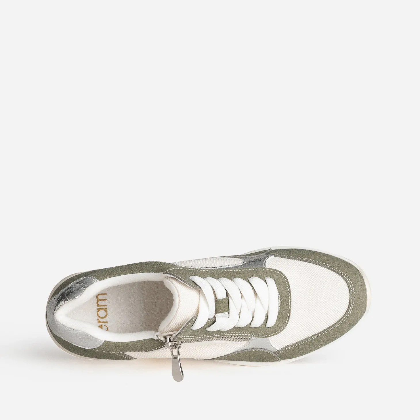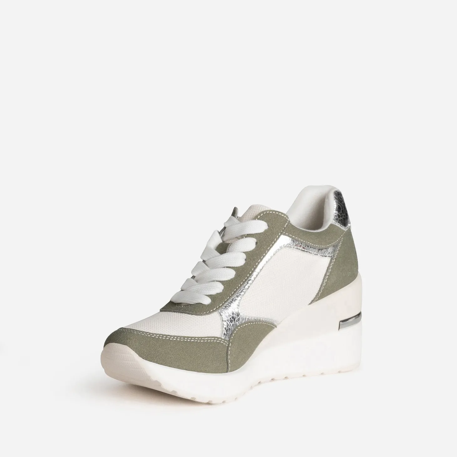 Prendre de la hauteur, même en tennis ? C’est possible avec ce modèle pour femme. Montée sur une semelle compensée de plus de 7 cm, cette basket basse bouscule les codes. Coloris kaki, blanc et argenté, elle maîtrise le mélange de matières à la perfection : matières synthétiques, suédée ou métallisée, et mesh. Le zip extérieur apporte du chic en s’accordant à la baguette argentée placée sur le contrefort. Essayez-la avec un tee-shirt blanc et un pantalon large de couleur grise.