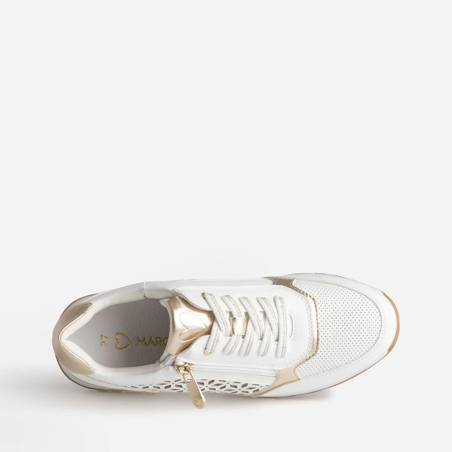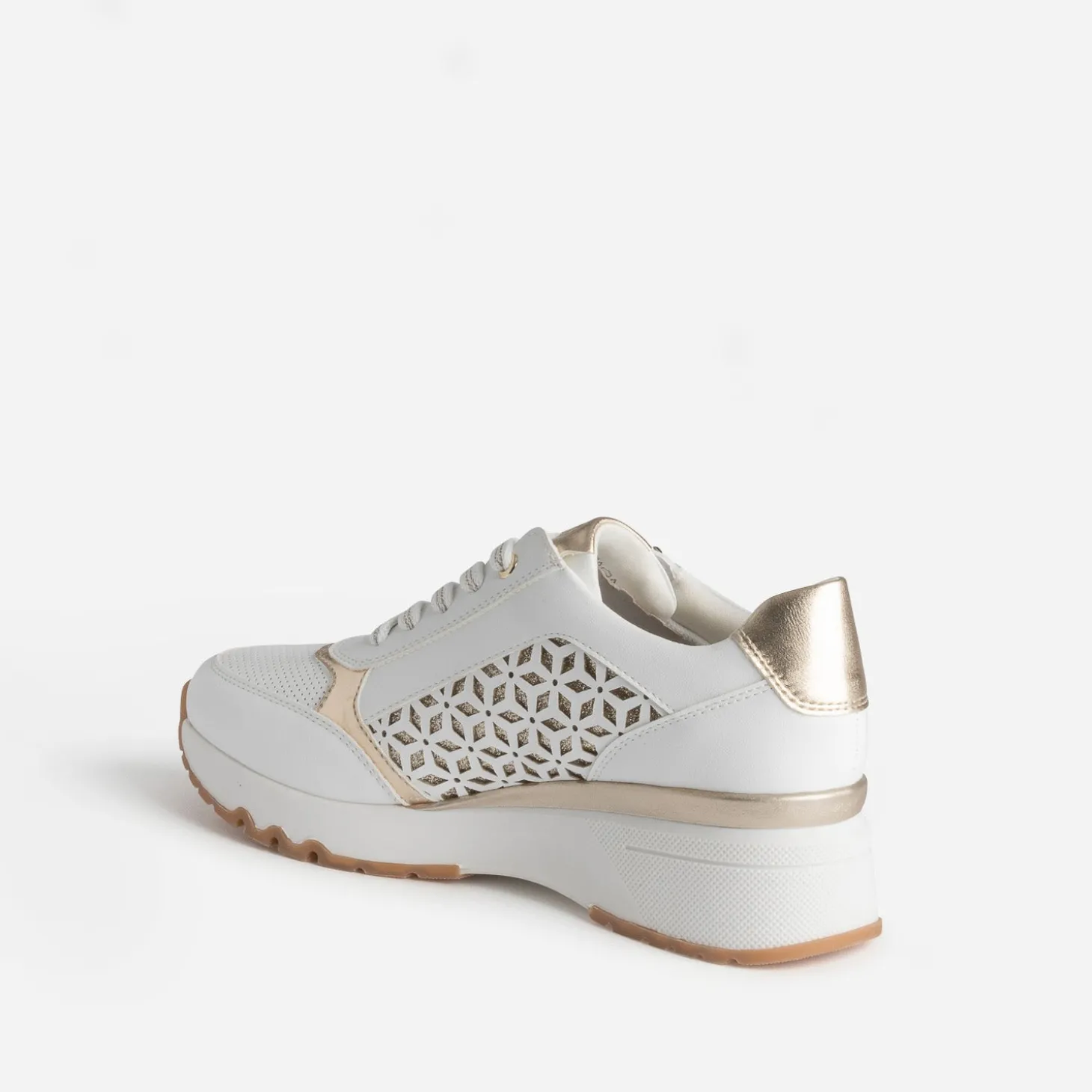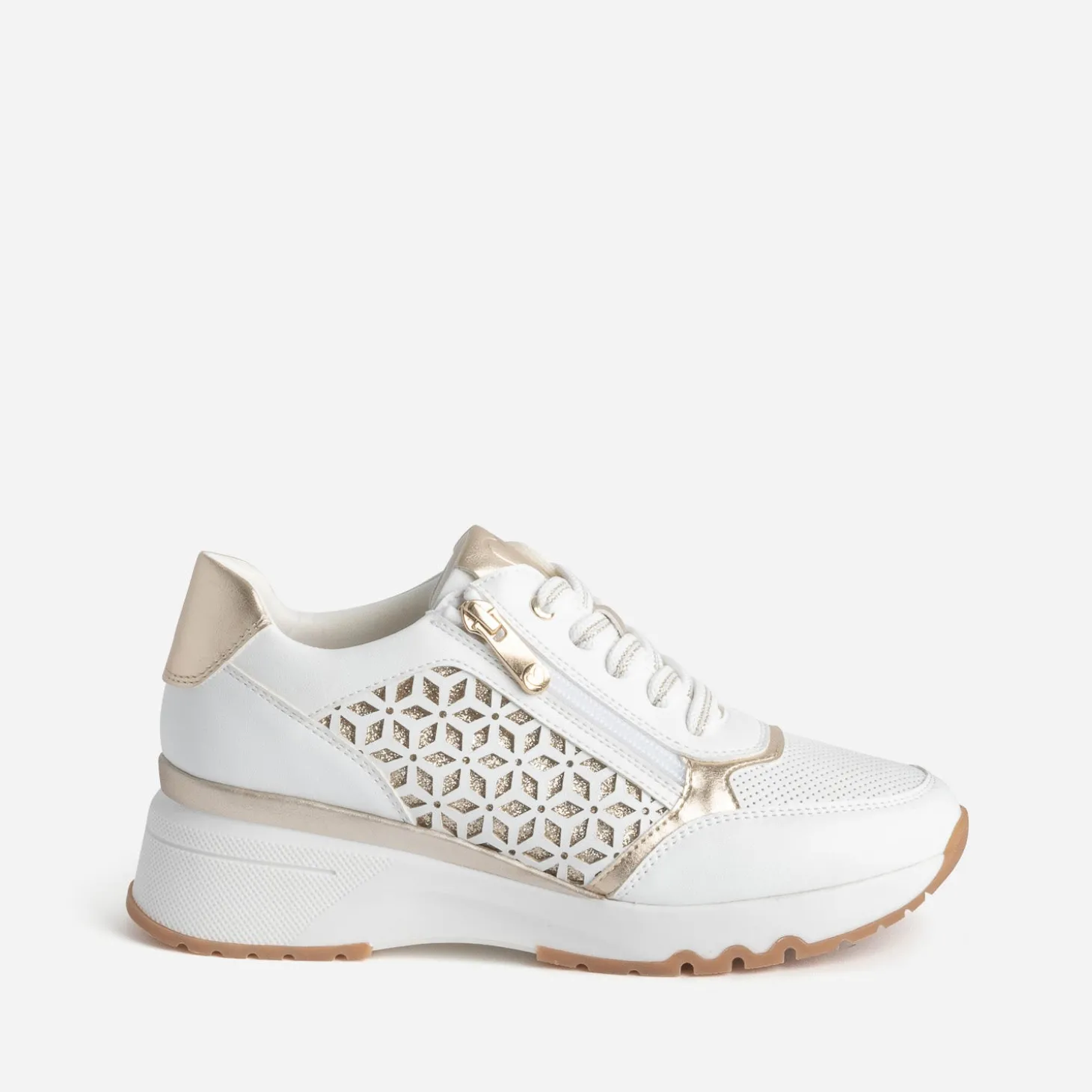 C’est la nouvelle forme de tennis compensée à ne pas manquer cette saison. Mix d’écru et de doré sur une matière synthétique lisse, elle se laisse rythmer de motifs graphiques ajourés sur les côtés et se ferme par lacet et zip latéral. La semelle première est amovible, pour accueillir votre semelle orthopédique adaptée. Alliez confort et mode, sans modération.