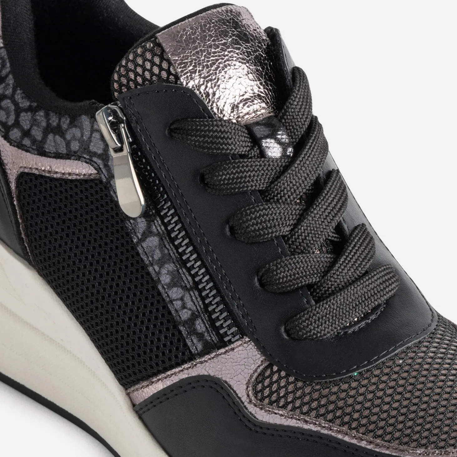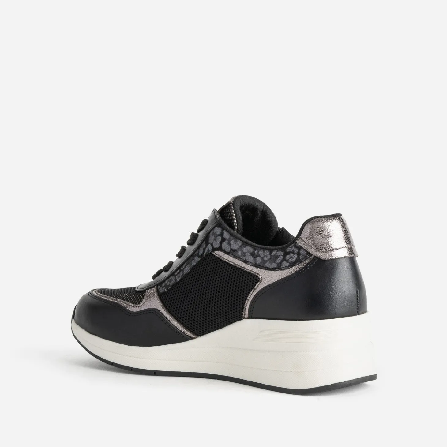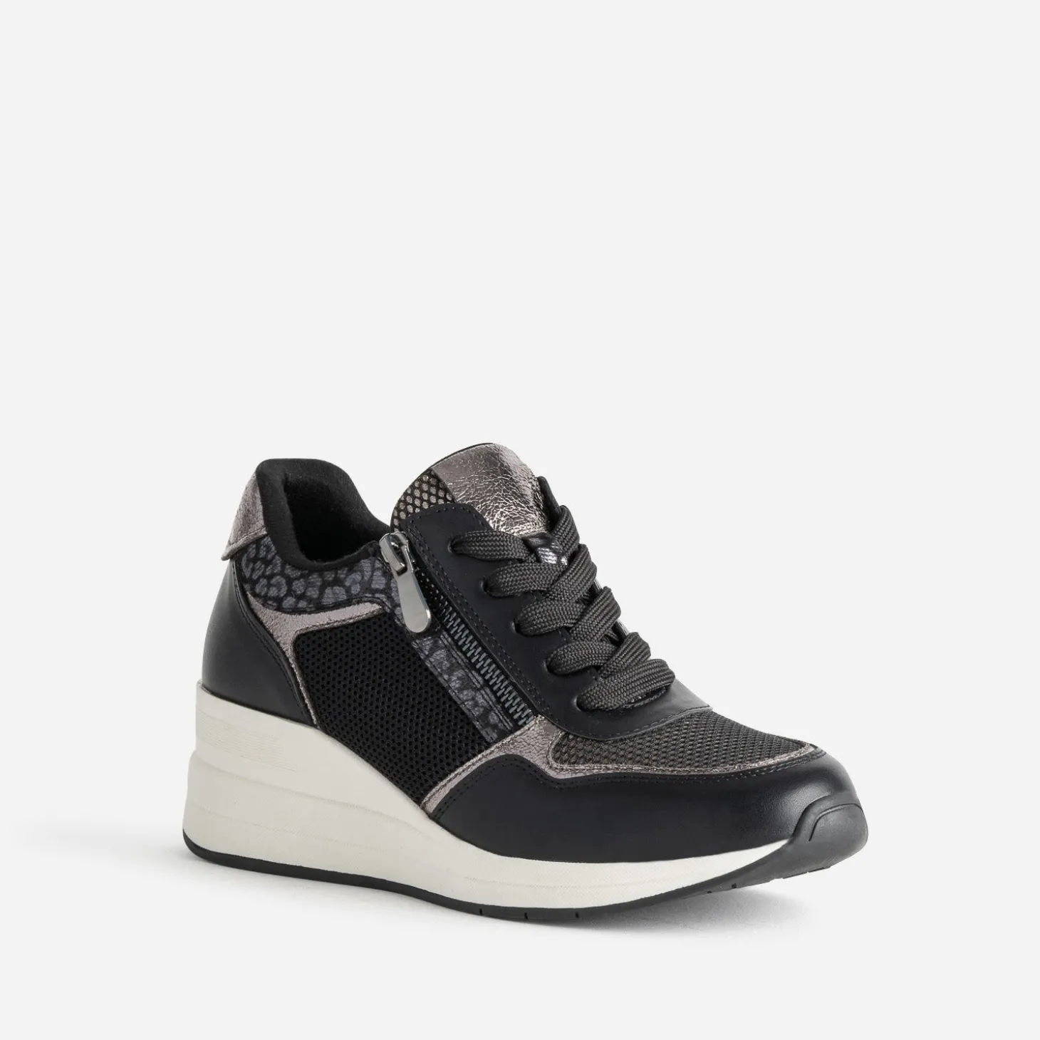 L’attention portée aux détails fait de cette tennis pour femme un modèle unique. Le camaïeu de noir et gris, sublimé par différentes matières et finitions, mesh, cuir lisse, cuir métallisé, effet léopard, crée un effet visuel saisissant. La semelle sport compensée assure une adhérence optimale, et la fermeture lacet/zip latéral facilite l’utilisation quotidienne. Un modèle idéal pour féminiser une robe sweat grise, en toute décontraction.