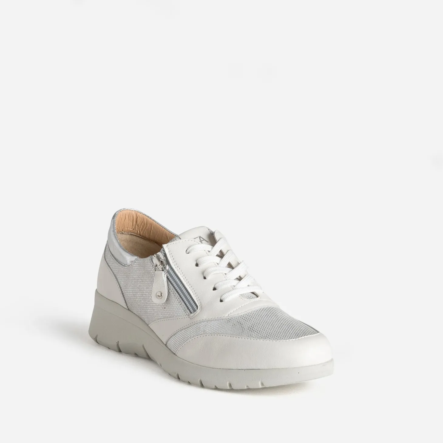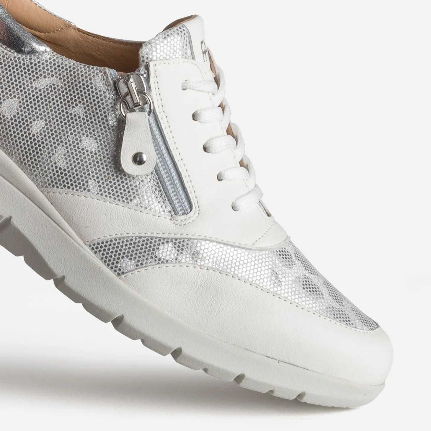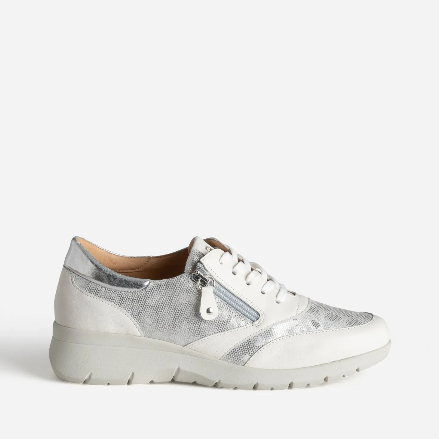 Cette tennis pour femme est une promesse de confort durable. Confectionnée en cuir lisse, elle se décline en coloris blanc et se démarque par un effet léopard gris argenté sur le dessus et les côtés de la tige, en accord avec la languette. Elle se ferme par un lacet et un zip latéral. Montée sur une semelle légèrement compensée, elle promet un confort incomparable, au quotidien.