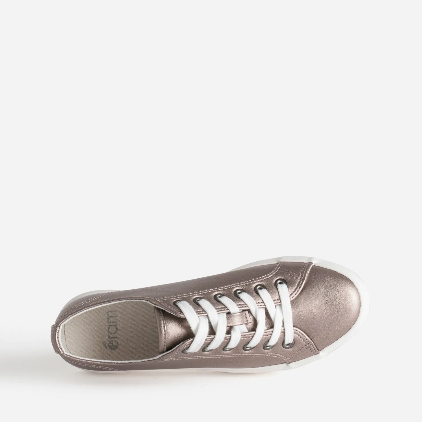 3,5 cm. C’est le nombre de centimètres gagnés en chaussant cette tennis pour femme. En matière synthétique lisse, elle se décline en coloris gris foncé, avec finition métallisée, sur une semelle blanche à plateforme, assortie au lacet. Un modèle idéal pour la mi-saison, à jouer avec des nuances de gris et un look décontracté.