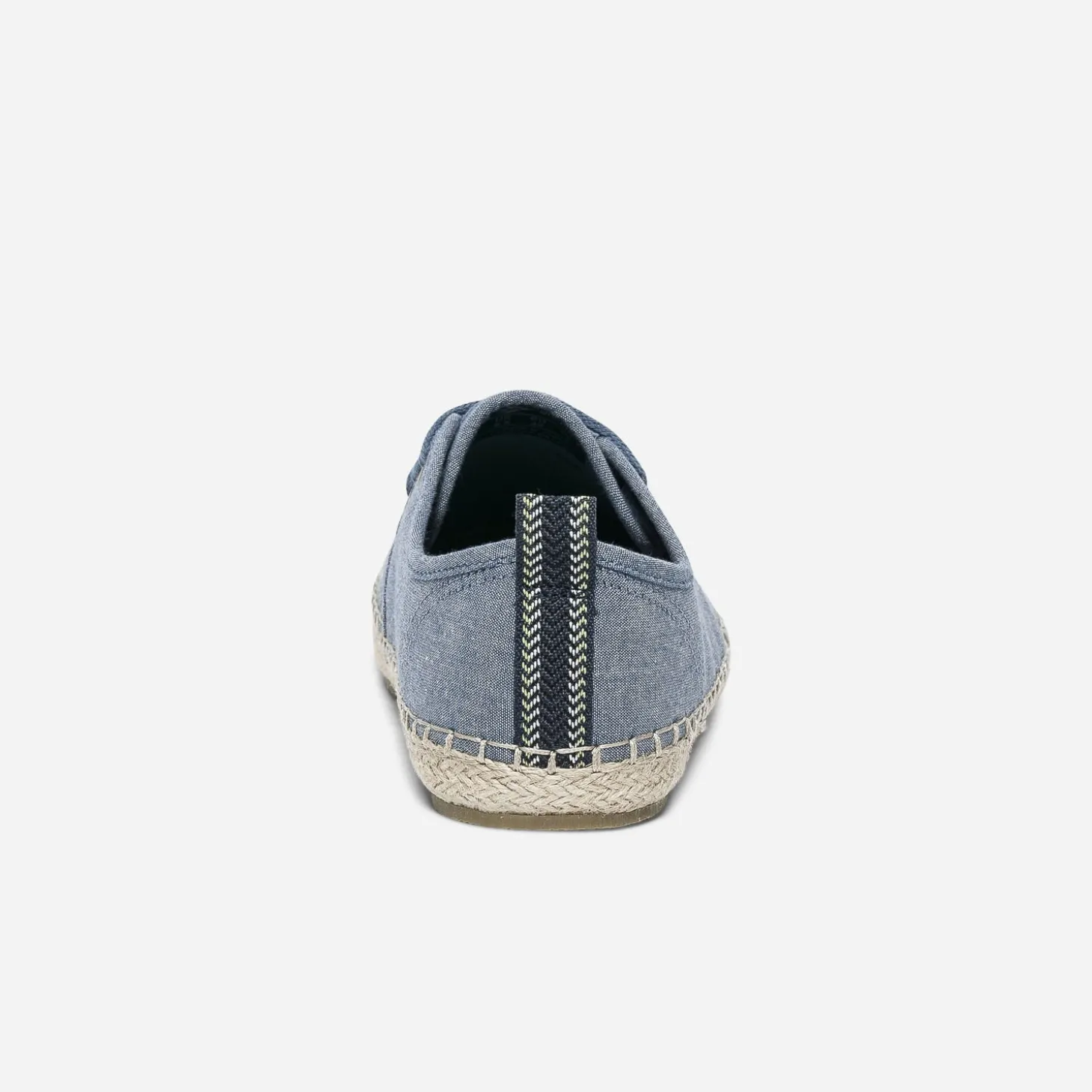 Appréhendez l’été sans compromettre votre style, avec cette chaussure hybride, mix parfait entre la tennis et l’espadrille. Confectionnée en toile bleu esprit chambray, avec doublure et première en textile assorti, elle est montée sur une semelle imitation crêpe, soulignée de corde naturelle. Un galon fantaisie placé sur le contrefort facilite l’entrée du pied. Un modèle à privilégier avec un tee-shirt ou une chemise légère et un bermuda beige ou kaki, en mode vacances.