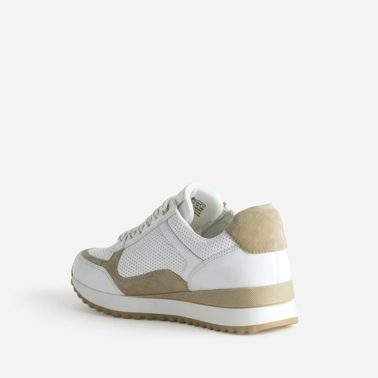 Blanc et beige côté couleurs. Cuir perforé et synthétique suédée côté matières. Cette tennis pour femme associe les contrastes, avec beaucoup de facilité. A l’intérieur, la semelle amovible permet de s’ajuster pour toujours plus de confort. Un modèle à imaginer avec une tunique en lin blanc et un pantalon chino beige, avec bords roulottés sur la cheville.