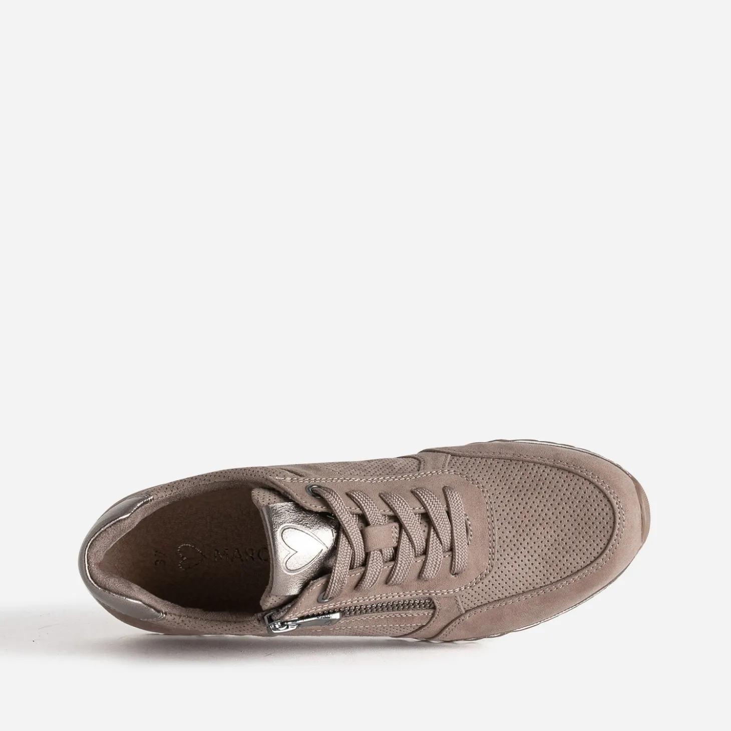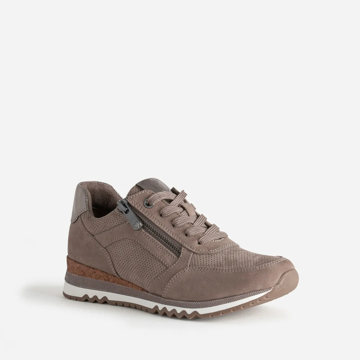 Cette tennis femme se décline en coloris taupe, idéale pour la mi-saison. Jeux de perforations, empiècements bronze métallisés sur la languette et le contrefort, apport de liège sur la semelle, les détails sont soignés. Montée sur une semelle sport crantée, elle présente une semelle première amovible et promet un confort inégalé.