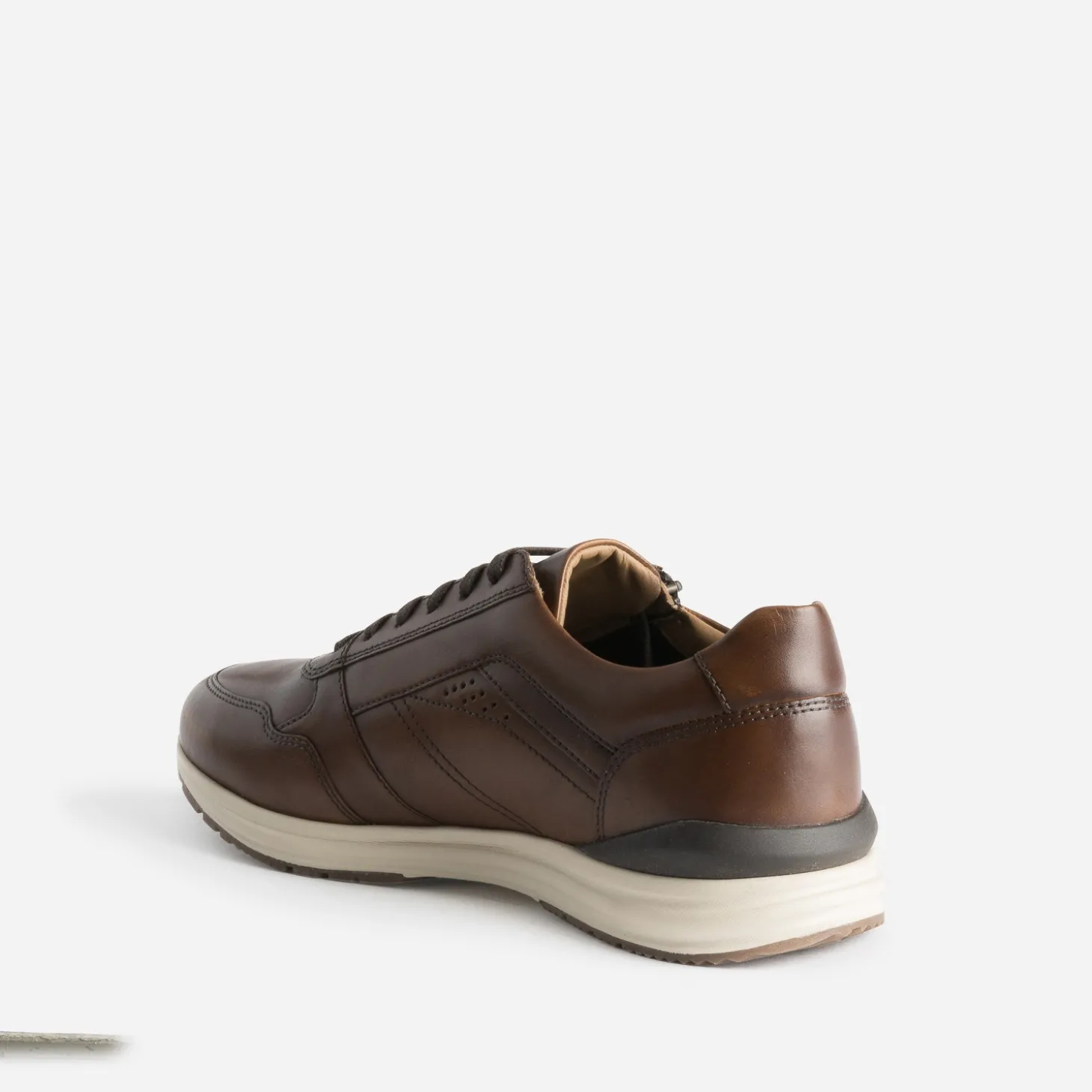 Dessus cuir, première cuir, doublure mix matière, cette tennis pour homme est un produit de référence, à tester cette saison. Déclinée en coloris marron, pile dans la tendance du moment, elle opte pour une ligne sportive, avec double fermeture par laçage et zip côté. Un modèle décontracté, fait pour le quotidien.