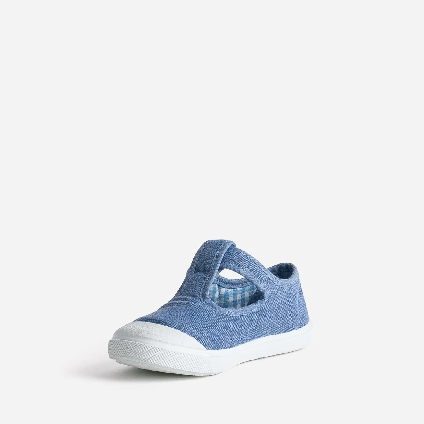 La chaussure en toile, c’est l’alliée des petits pieds et d’un mood printanier. Bleu, façon denim, elle se réinvente avec un style salomé, caractérisé par une bride en T, fermée par un scratch. L’intérieur prend des airs rétro, avec une doublure à motif vichy. Un modèle idéal au quotidien, en robe comme en pantalon.