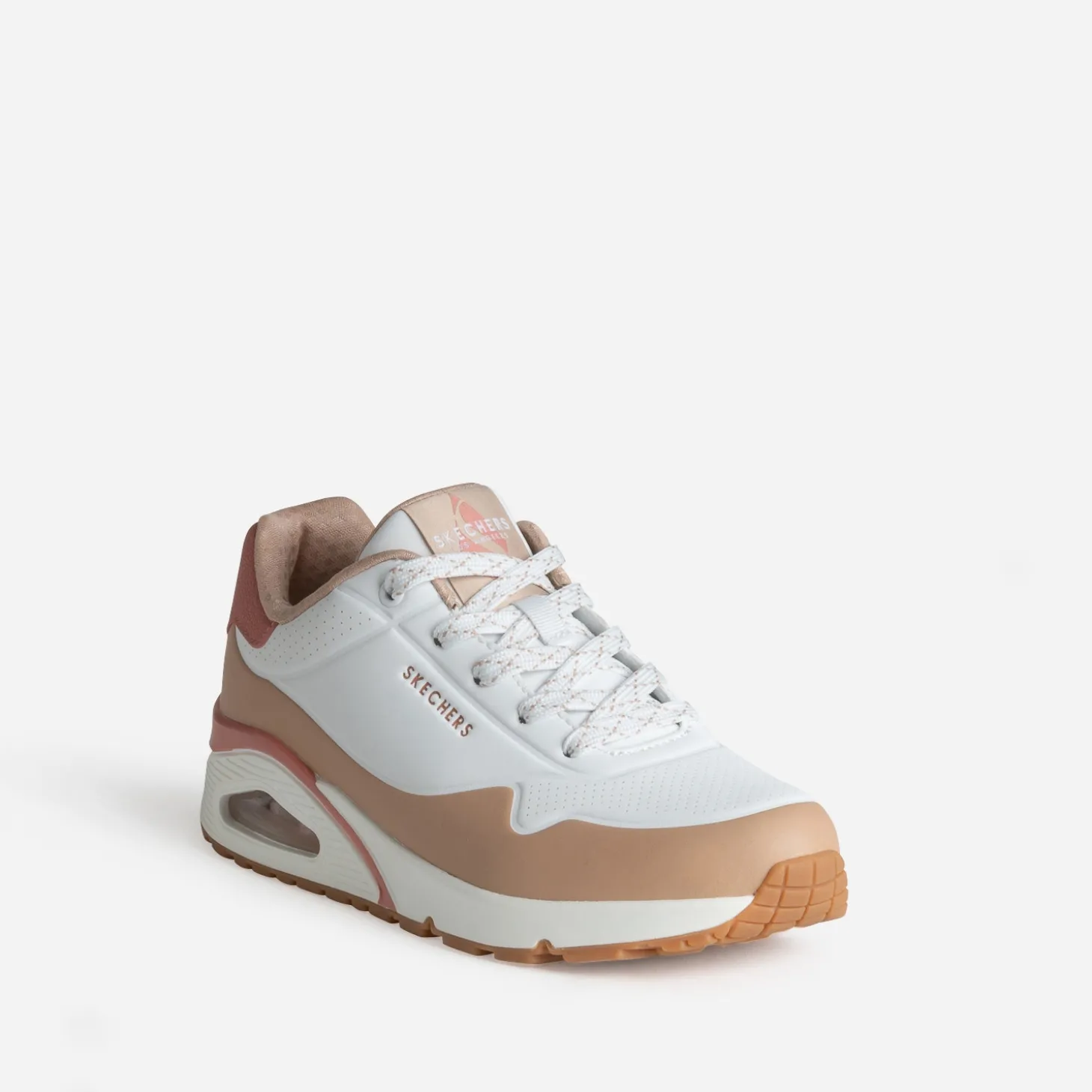 Le modèle Uno pour femme concilie deux grandes tendances, celle des sneakers et celle des teintes naturelles. Mettez une touche de fun dans vos looks avec cette tennis blanche et beige, rythmée d’un contrefort rose. La semelle intérieure se démarque par un système Air-Cooled à mémoire de forme, pour un confort incomparable et une respirabilité incomparable. Une tennis pour faire le show, en jean mom gris et sweat pastel.