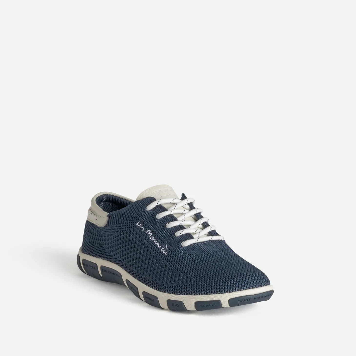 Signé ‘Les Marinières’, cet iconique de la marque, conçu en textile tricoté, inspiré du mesh des équipements de sport et non doublé, est reconnu pour sa légèreté, sa souplesse et sa résistance. Adoptez, sans attendre, cette tennis pour femme en coloris bleu marine, avec lacet rond délicatement rayé et semelle contrastée. New York, Hawaï, Saint Malo ou Hong Kong, voyagez le pied léger !