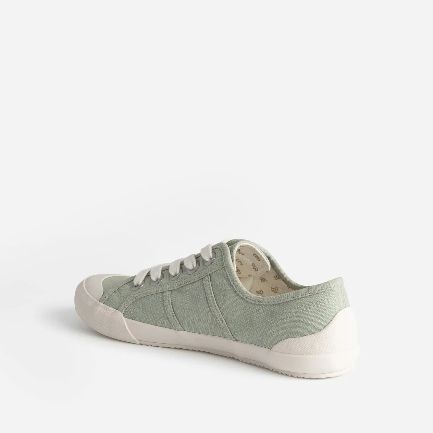 L’incontournable tennis en toile va vous séduire ! En coloris vert sauge, elle est rythmée de surpiqûres sur les côtés et renforcée de caoutchouc sur le bout et le contrefort pour plus de résistance. Un modèle qui se porte au quotidien pour un look casual et tendance, empreint d’une touche de chic.