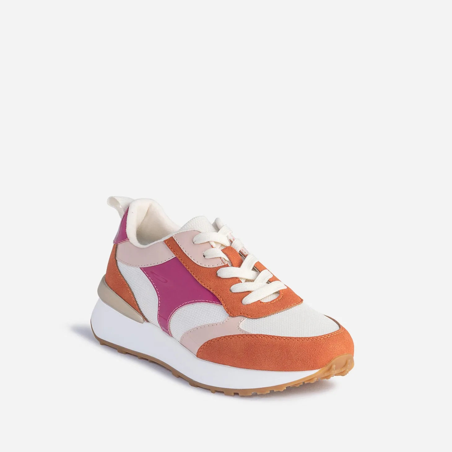 Beige, c’est la couleur dominante de cette tennis pour femme, rythmée de touches terracotta, rose foncé et rose poudré. Mix de matières synthétiques suédées et de mesh, le tout twisté de détails vernis, elle est montée sur une semelle sport légèrement compensée. Un modèle à privilégier avec une tenue sporty et décalée.
