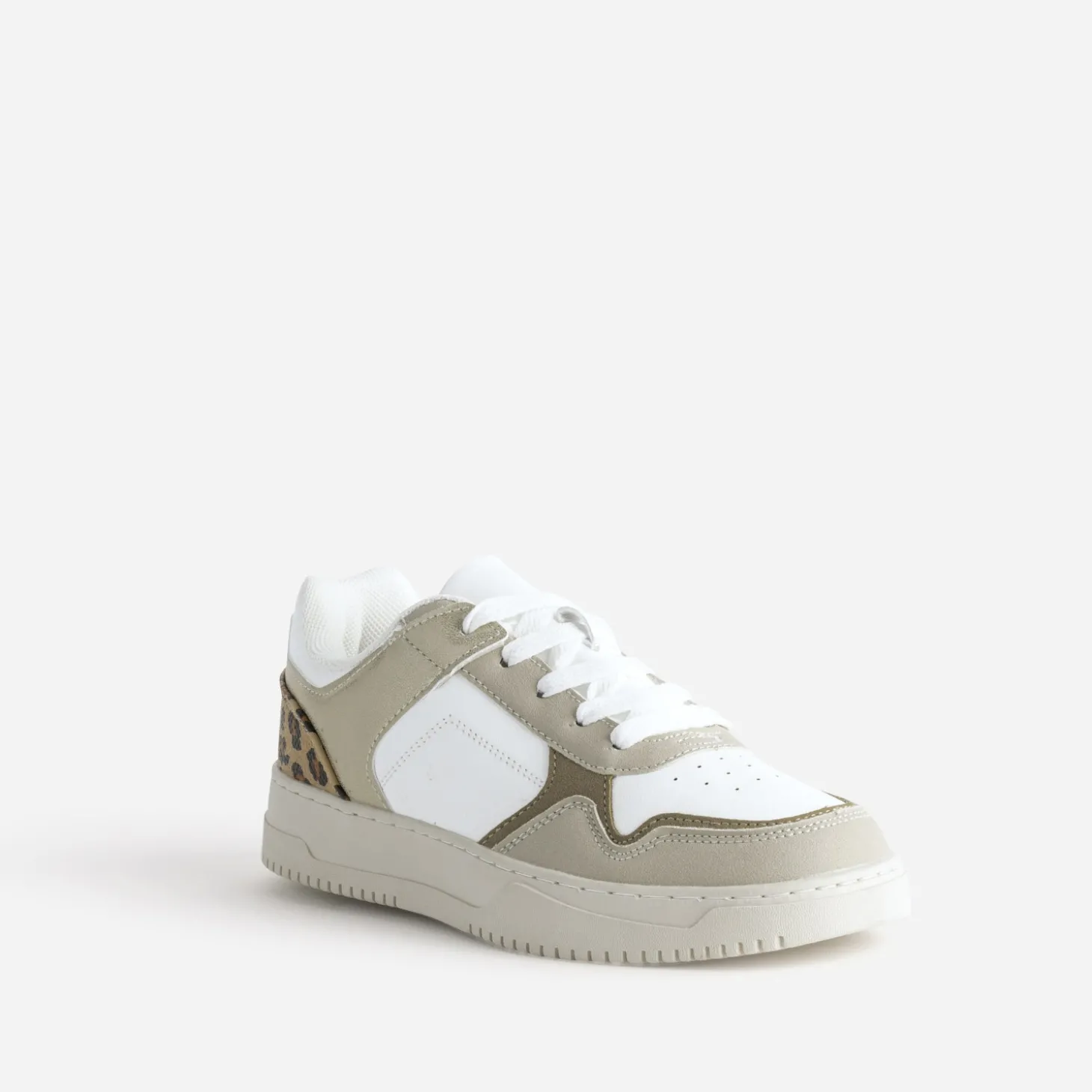 La tennis s’est élevée au rang de chaussure star, depuis plusieurs saisons. Confectionnée en matières synthétiques lisses et veloutées, elle associe le blanc, le beige et le marron, à des touches de doré sur les côtés, et à un empiècement à motif léopard sur le contrefort. Elle est montée sur une semelle contrastée beige clair, et se ferme par lacet. Un modèle au design dans l’air du temps, à jouer avec une tenue décontractée : tee-shirt blanc, jean bleu, ceinture à motif léopard.