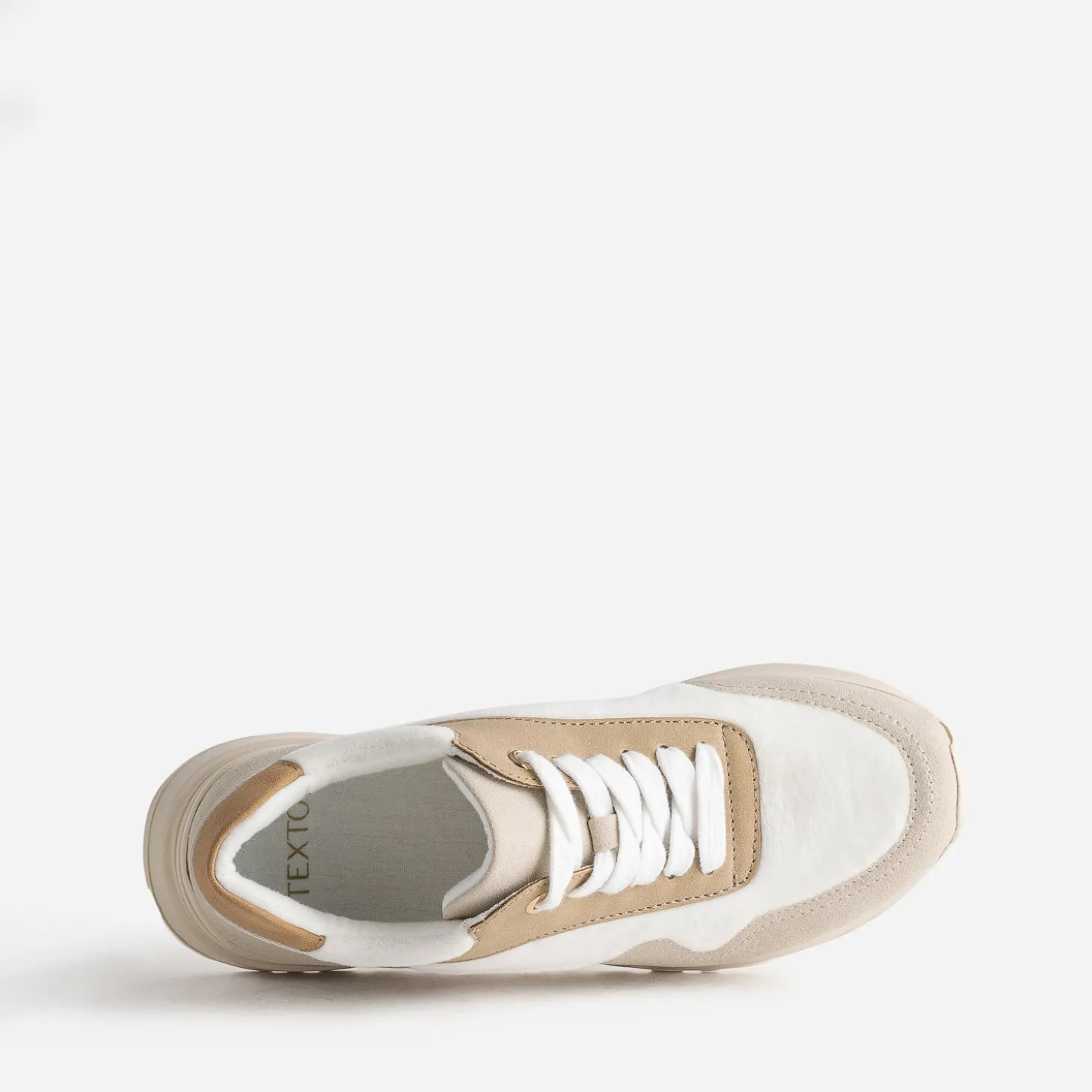 Passion couleurs pastel. Passion sneakers. Cette tennis femme concilie tout ce dont vous rêviez. Matière synthétique douce blanche, matière synthétique suédée beige et camel, elle s’invite du bon pied dans le printemps, et tout au long de l’été. Imaginez-la avec un costume pantalon camel.