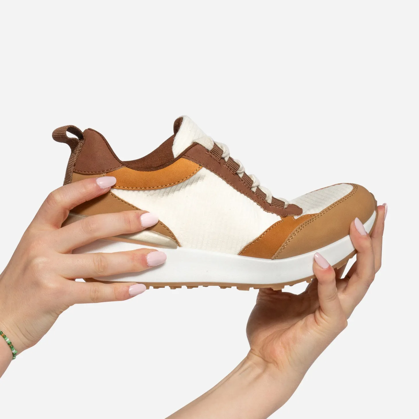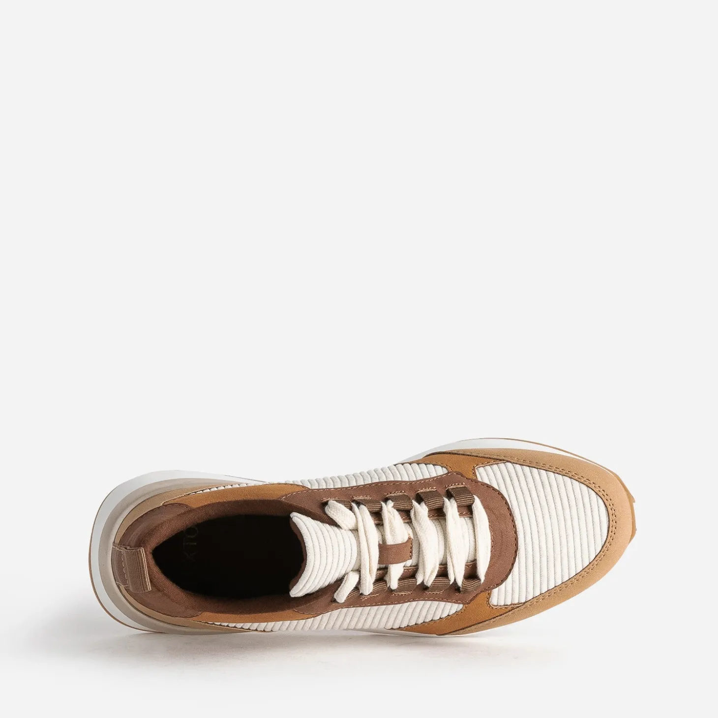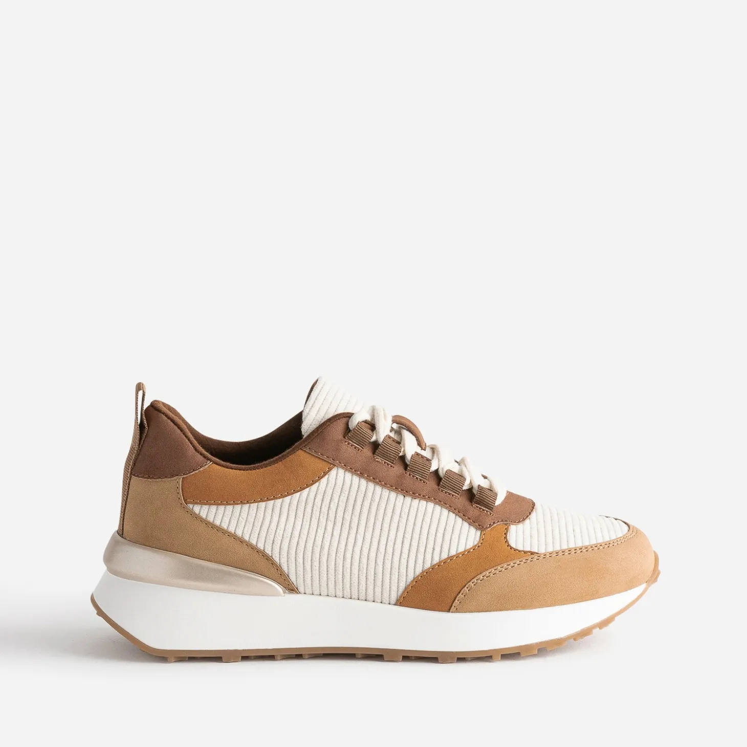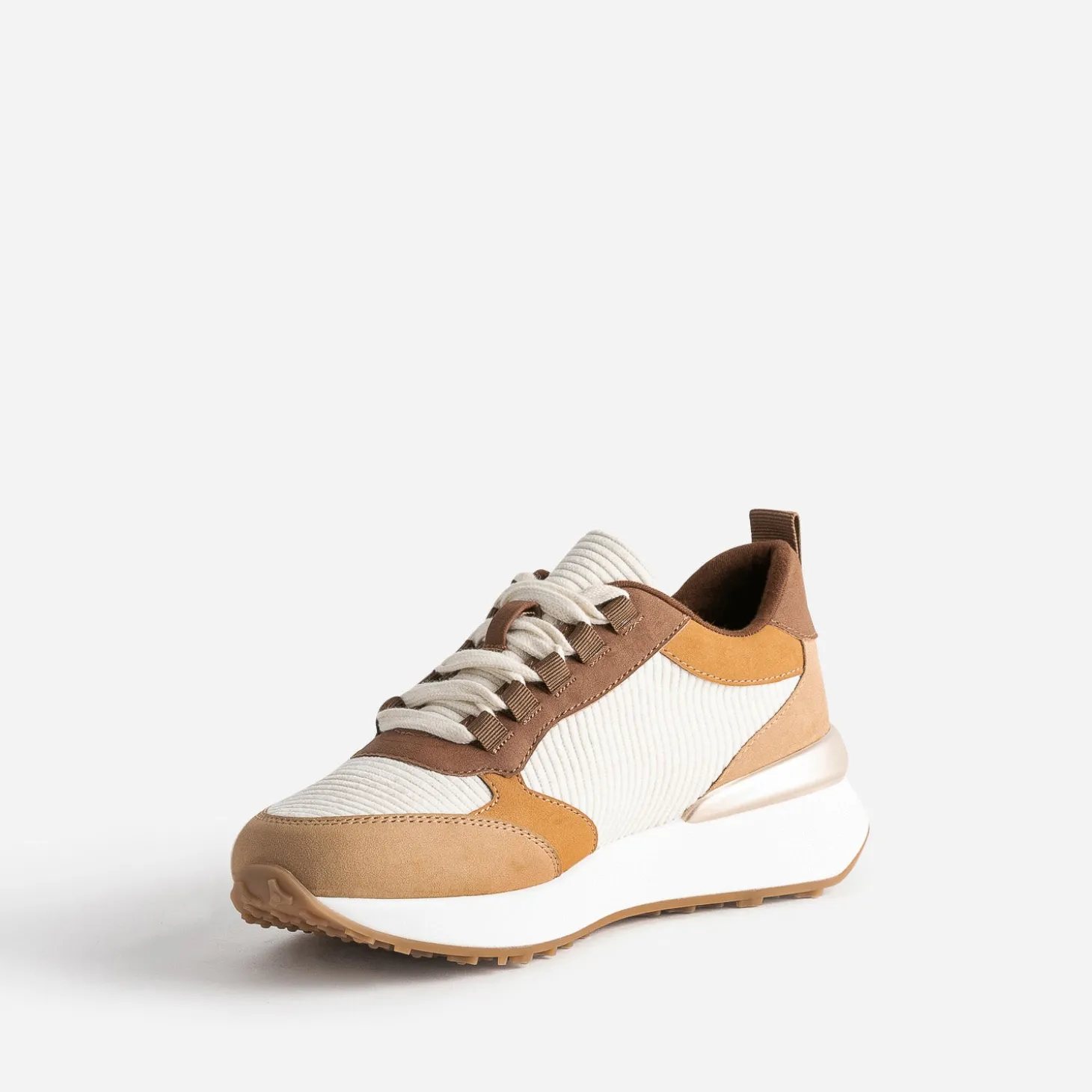 Camel, marron, écru, ce sont les couleurs dominantes de cette tennis pour femme. Mix de textile velours côtelé et matière synthétique suédée, elle est montée sur une semelle sport légèrement compensée. Un modèle à privilégier avec une tenue dans les tons naturels, avec des touches de doré.