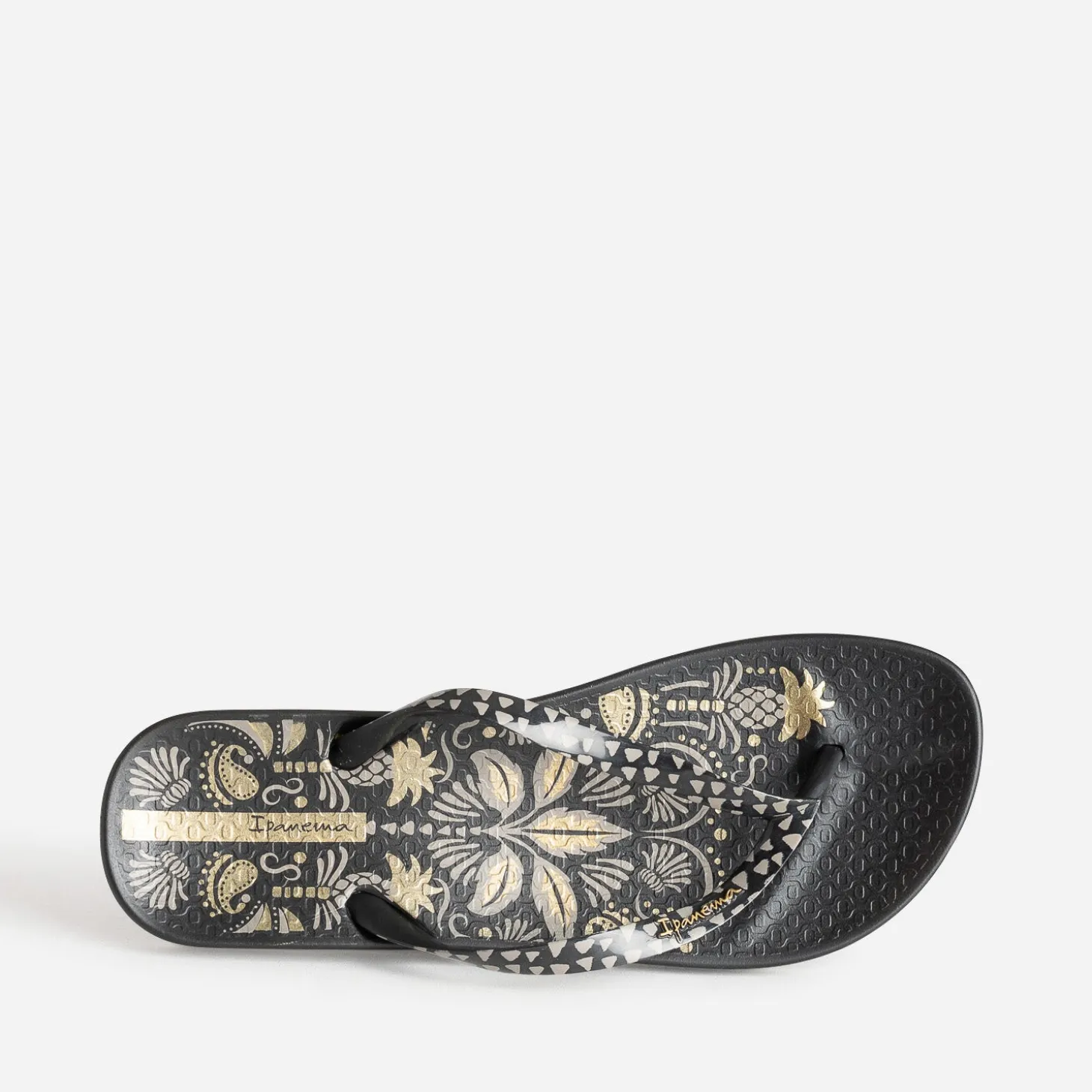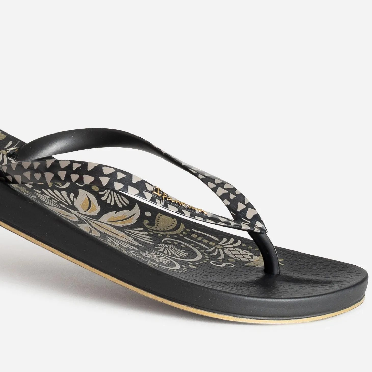 Adepte des tatouages permanents ou éphémères ? Cette tong est faite pour vous ! Bien plus qu’une simple chaussure de plage, elle dévoile une semelle ornée d’un motif floral gris et doré sur fond noir, façon parure tatouée, et des brides graphiques. Un modèle au confort iconique, à accompagnera d’un combishort noir et de bijoux dorés.